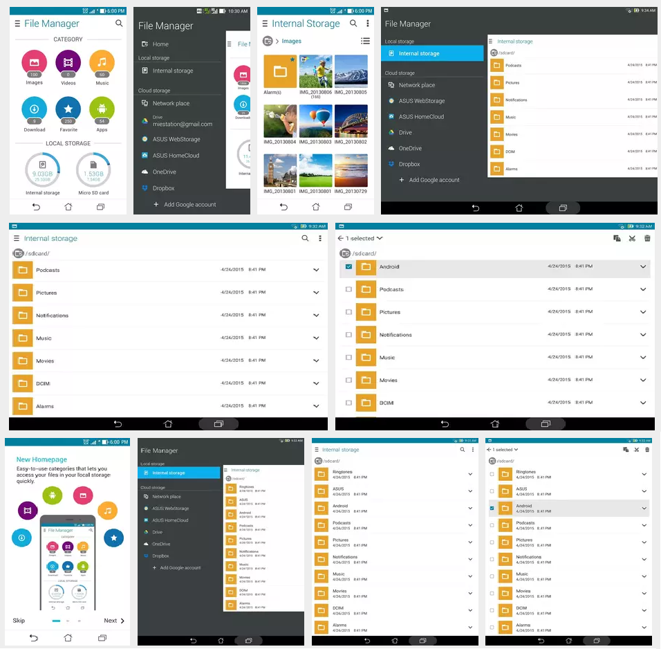 ASUS File Manager는 ASUS에서 개발된 강력한 파일 관리 도구입니다. 이것을 이용하면 파일들이 내장 메모리에 저장되어있든, 혹은 SD카드나 클라우드에 저장되어있든 상관없이 안드로이드에서 모든 파일을 관리할 수 있습니다.