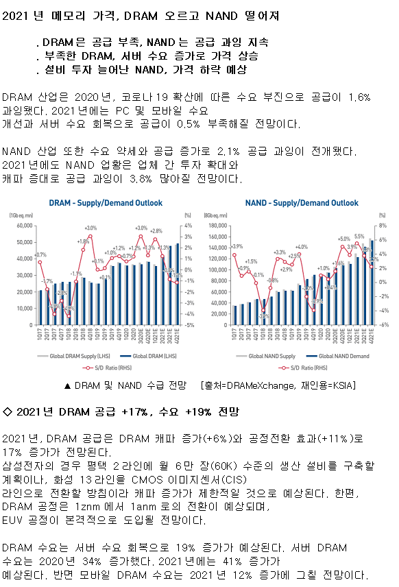 반면 NAND는 수요에 비하여 공급 수량의 증가로 인하여 가격이 떨어 질 것이라고 한다.