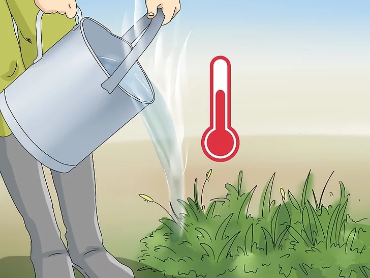 2. 끓는 물로 잡초를 제거하세요. 근처에 다른 식물이 살지 않는다면 끓는 물을 큰 대야에 받아 부어버리세요. 끓는 물은 잡초를 태워서 죽이기 때문에 다른 식물 근처에는 사용하지 마세요. 끓는 물은 어린 잡초에 굉장히 효과적이며 보통 결과가 즉시 나타납니다.