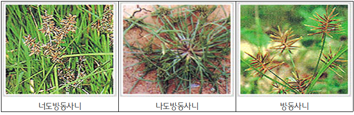 ④ 방동사니과 다년생잡초 : 너도방동사니, 매자기, 올방개, 올챙이고랭이, 쇠털꼴, 파대가리