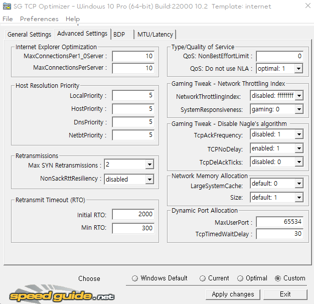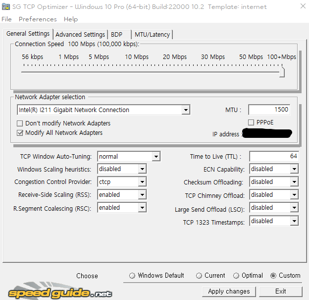SG TCP Optimizer : 수정값은 위 그림과 같음