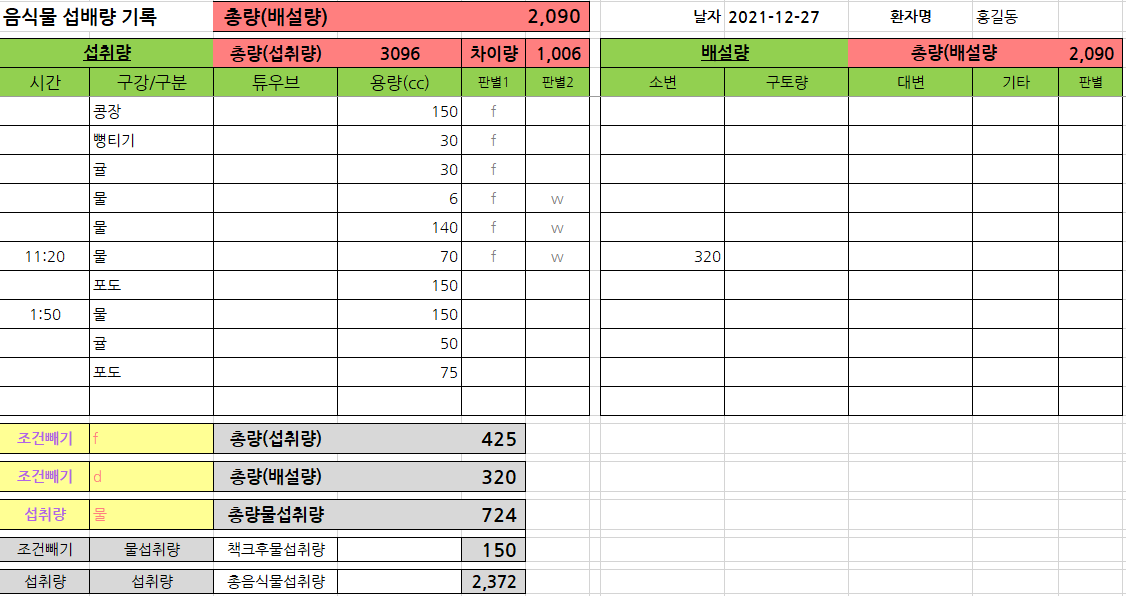 처음에는 기준이 없어서 모든 음식물을 기록을 하였지만 그중에서 물섭취량과 배설양입니다.