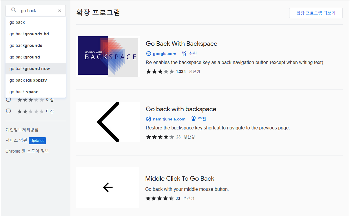 크롬스토어에서 Go Back이라고 입력하고 검색해보면 몇 가지가 있다. 원하는 것을 추가하여 Backspace 키를 사용할 수 있다.
