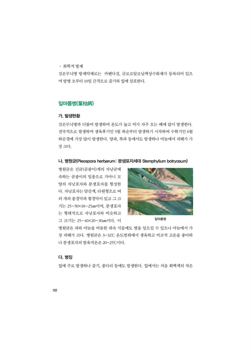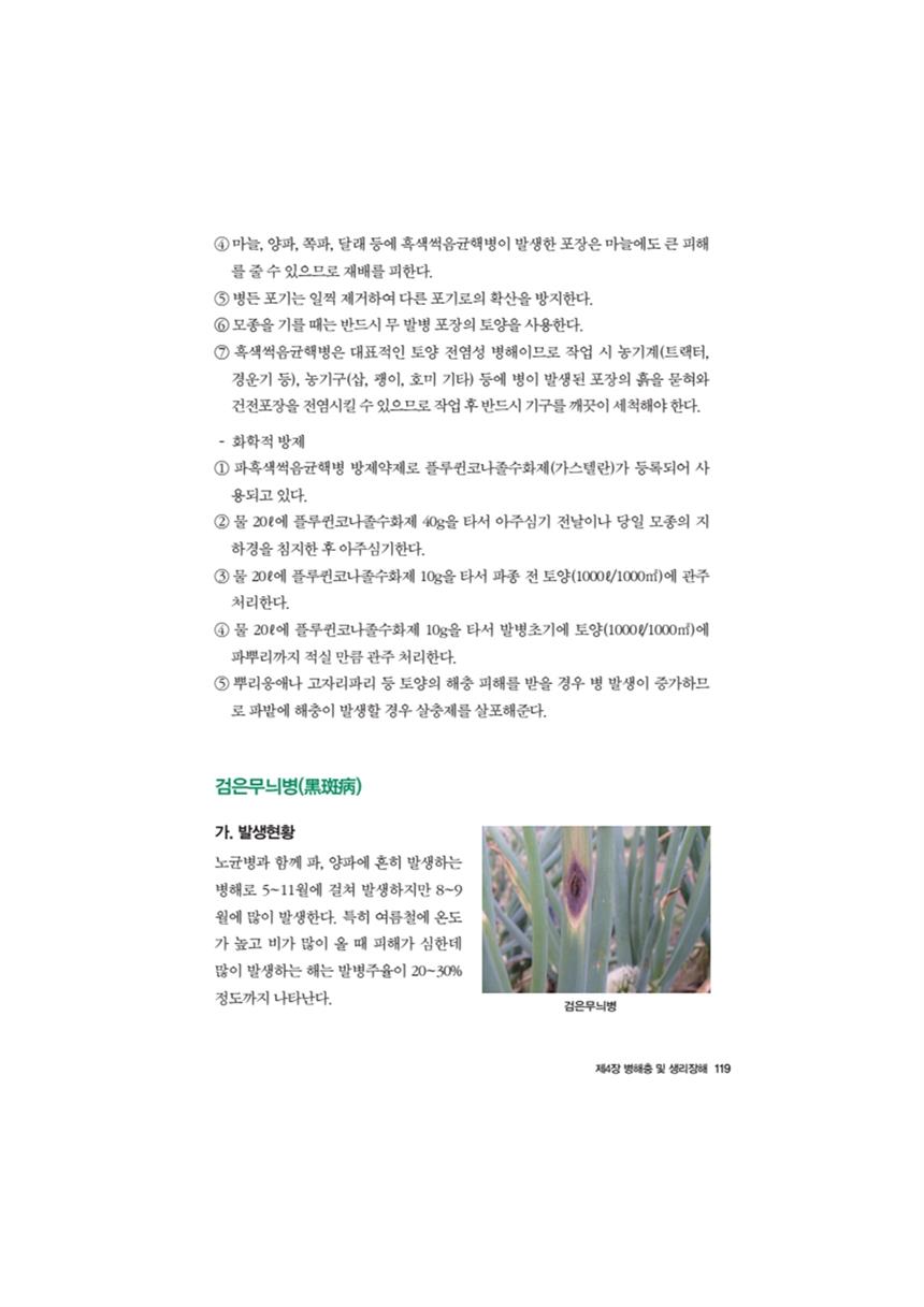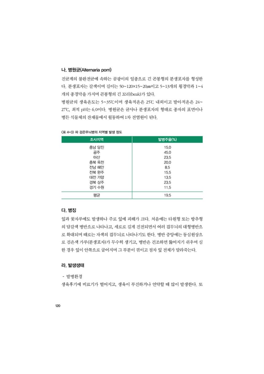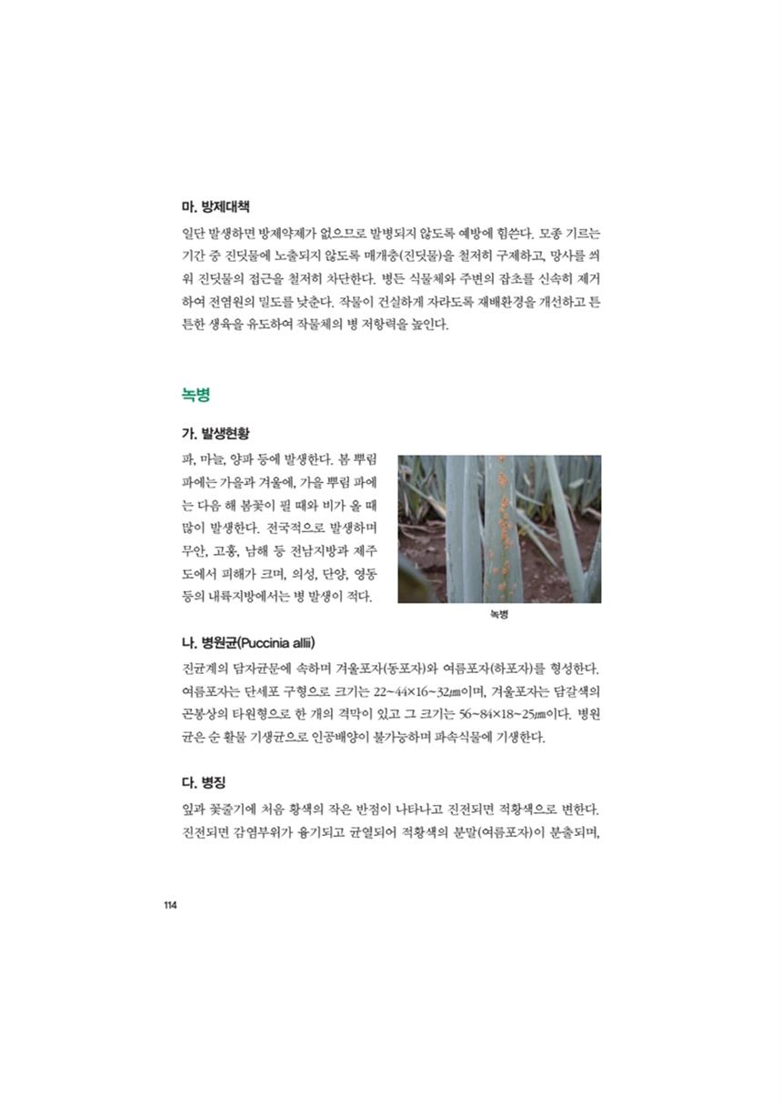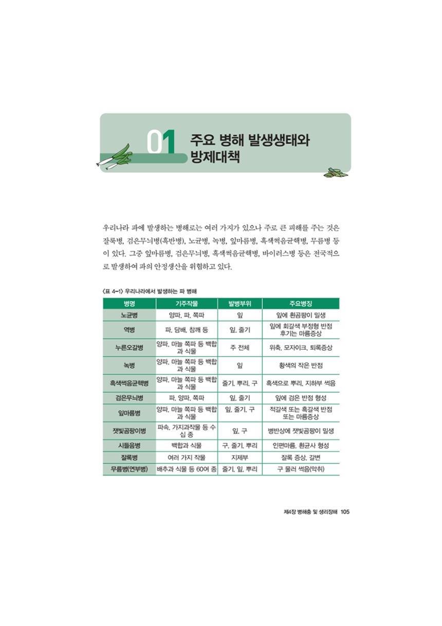 영농길잡이에서 대파 병해발생과 방제부분을 올립.